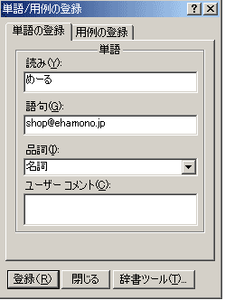 これで、次回から、「めーる」って打って変換すると[shop@ehamono.jp]って出ますので、間違いがないです。